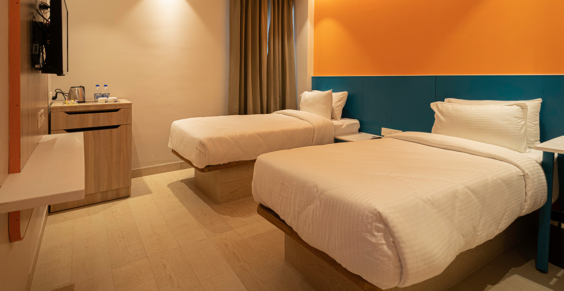 The Deluxe Twin Room is a spacious and luxurious room designed to provide comfort and convenience for travelers. It typically features twin beds, which can accommodate up to 3 adults. The room is equipped with modern amenities such as a large flat TV-screen, the bathroom is fitted with a shower and includes premium bath amenities. The room is designed to provide a relaxing and rejuvenating experience for guests, with a focus on comfort, style, and convenience.
